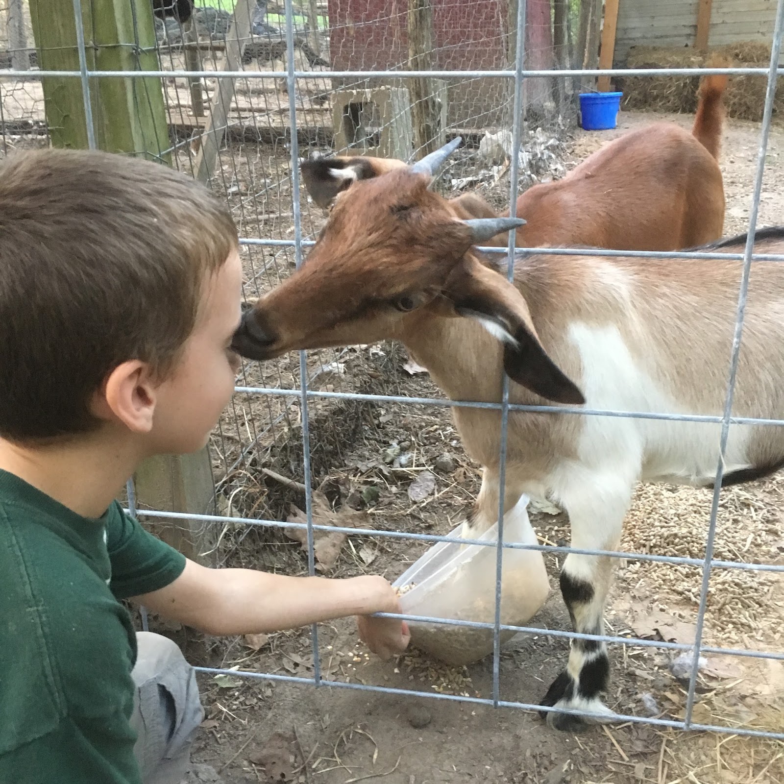 They have been so much fun the last couple of days. They are getting more comfortable with us. We have discovered that Willow tends to be the most curious, but also very cautious. Charlotte seems to be the more agile and adventurous. They seem to really enjoy the children, especially Benjamin, probably because they are about the same size. They also seem very taken with Noah, but that's not surprising because he is comfortable with all of the animals. Evelyn and Jacob are becoming more comfortable with them, they move too fast and is frightens the goats a bit. Nathan likes to watch them from a far. The goats and I are having a bit of difficulty because I was a source of stress for them in the beginning. Catching them, carrying them around, collaring them, leashing them and teaching them to walk on a lead has all been very stressful. They are really fast learners and I guess I am too. I have learned that a pan of scratch will guide them pretty much anywhere you want them to go, and so will a hand full of raisins. They still don't like being on leash, but they don't mind as much when they are distracted and I am assuming as they get older they will mind less and go along with what we need them to do. as much as I want to let them roam the yard, stray and roaming dogs in our area make me nervous for their safety. as they get older we will have more fencing for them as we rotate it around the yard for them to browse.